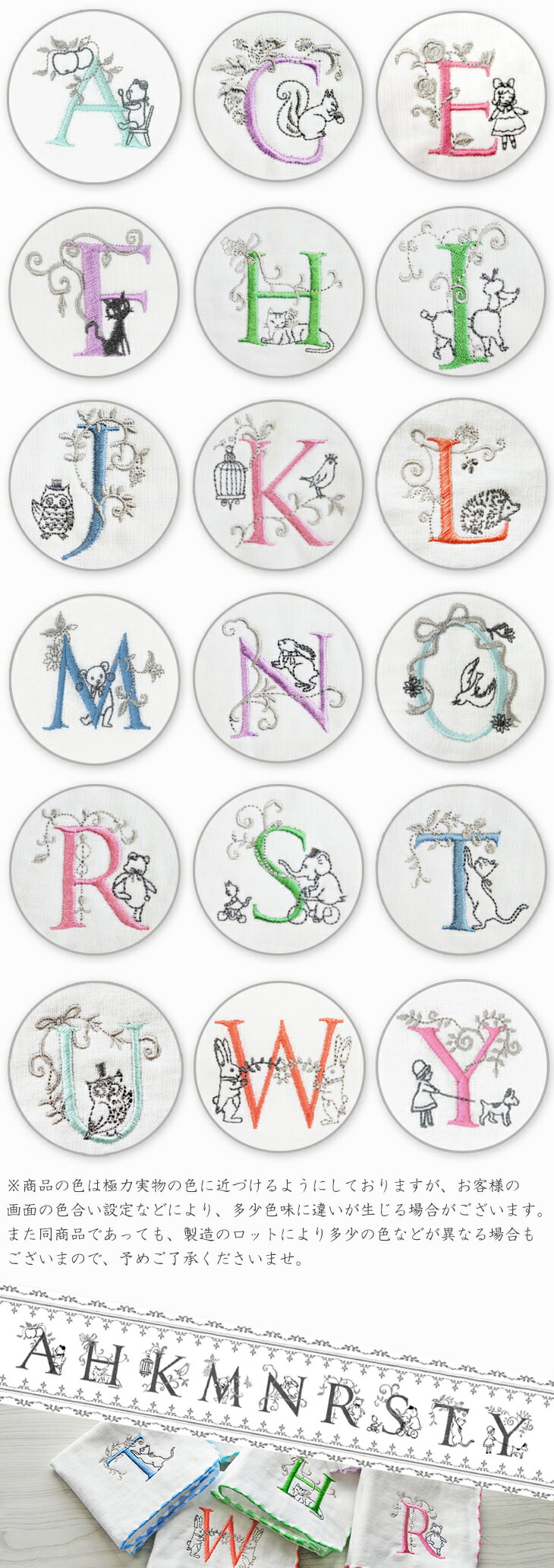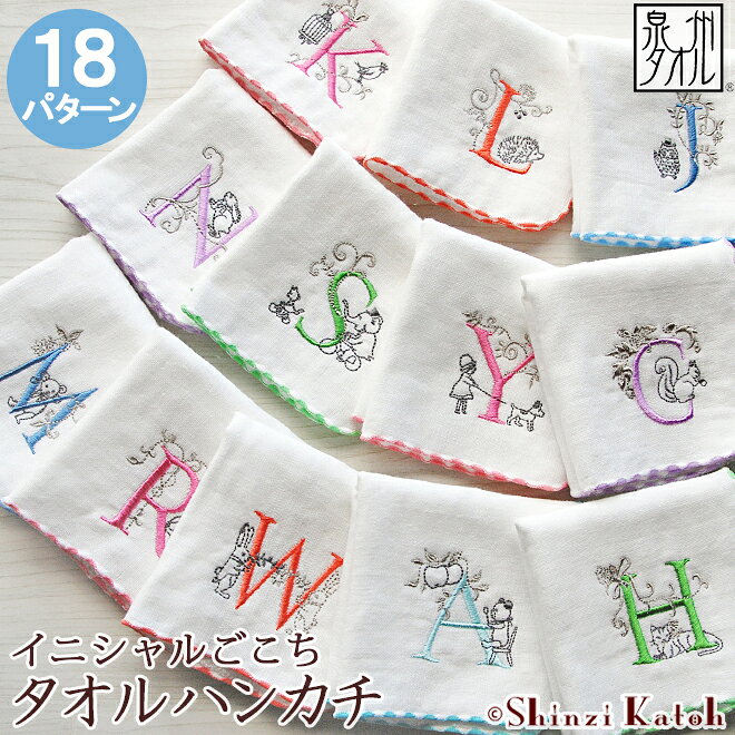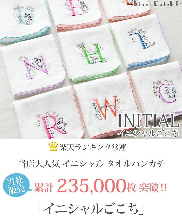 イニシャルが際立つ特別なタオルハンカチ イニシャルごとに異なるモチーフ刺繍は、Shinzi Katohの遊び心とセンスが光るデザイン。 イニシャル以外の刺繍糸は、あえてシルバーやグレーなどのシックな色合いにすることで、 上品な雰囲気の中に鮮やかな一文字のアルファベットが際立ちます。