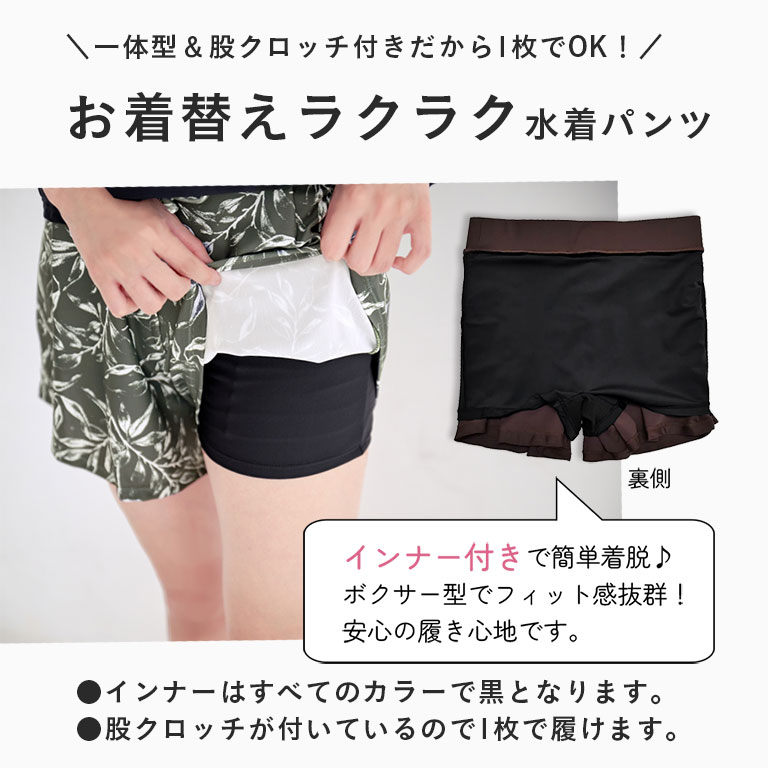 【こちらはインナー1体型パンツ単品のページです】 これ一枚でOK!さっと履けるインナー1体型水着用パンツ♪ インナーパンツがくっついているので、面倒なお着替えがラクラク! ショート丈・ミドル丈・七分丈からお選びいただけます。 【おすすめポイント】 ●股クロッチ付きのインナーパンツが一体化したデザインなので、インナーショーツや水着ショーツを履かずに1枚で着用OK!着脱がとても簡単です。