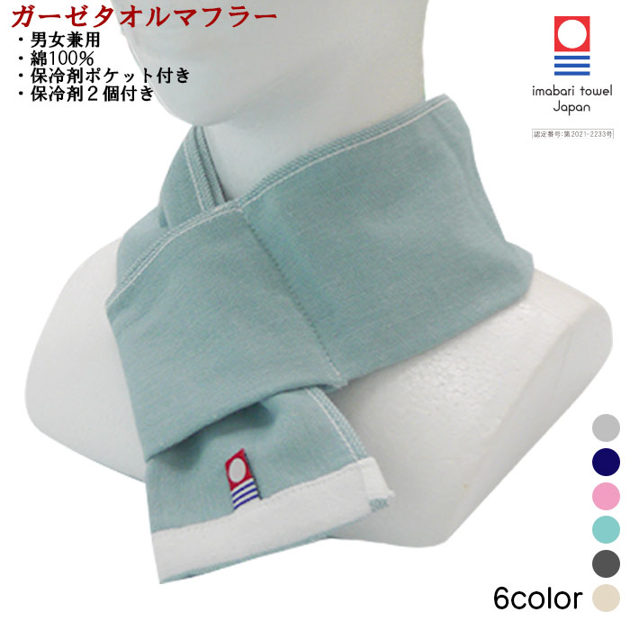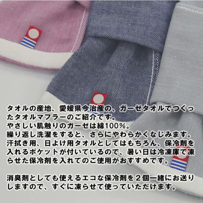 保冷剤2個入り今治タオル 無地マフラー綿100% ガーゼタオル 首ひんやり 首を冷やす 首冷却 男女兼用 差し込みタイプ 保冷剤ポケット エコ保冷剤 消臭剤として使える保冷剤 熱中症対策 暑さ対策 ネッククーラー アウトドア、ランニング、ウォーキングのおともに カラフルなカラー展開! 日本製・今治産の、ガーゼタオルでつくったタオルマフラーのご紹介です。