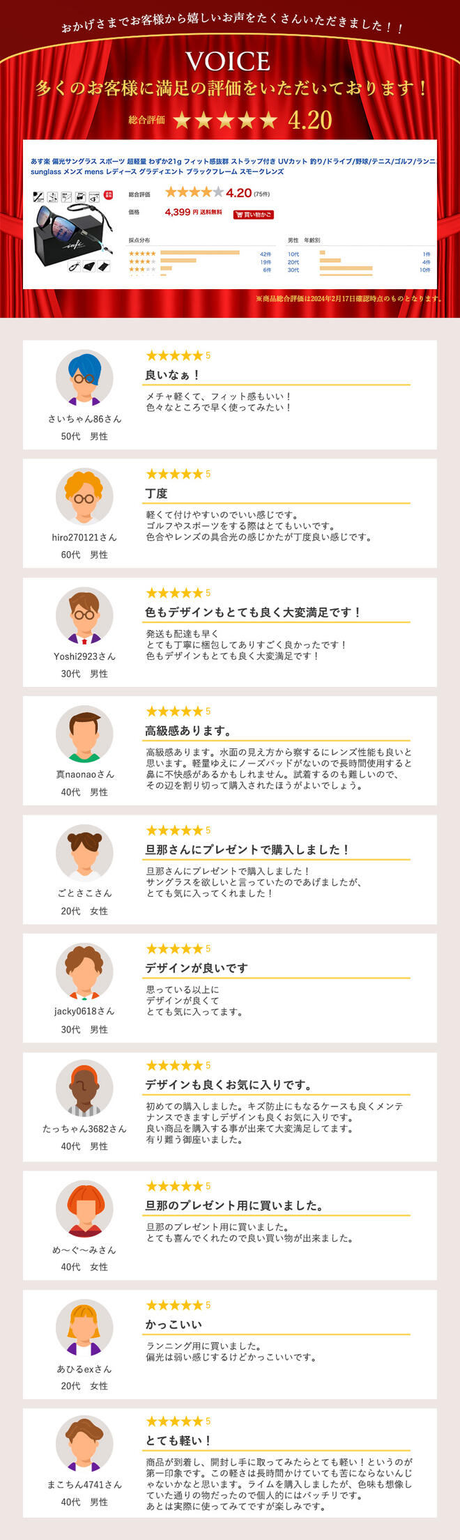 - 【わずか23.8g】 耐ストレス性素材を採用したフレームは、耐久性だけではなく驚きの軽さを実現。長時間かけていても疲れにくいUV400偏光サングラスに仕上げました。
