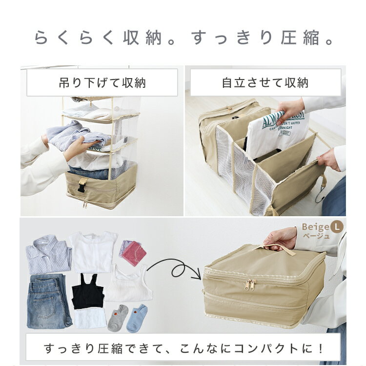 圧縮して、キャリーケースにそのまま入れるだけ! 普段の収納や、滞在先のホテルなど、衣類を入れ替える手間がなく便利♪ Lサイズ:1泊分、1人分の荷物にちょうどいい! XLサイズ:2泊以上、家族の荷物をまとめて入れられる! 〜ホテルのクローゼット、洗面所、病院、車内など〜 商 品 詳 細 カラー ベージュアッシュピンクグレージュグレーブラック サイズ Lサイズ 収納時:約幅30×長さ30×厚さ4cm 使用時:約幅30×長さ30×厚さ66cm XLサイズ 収納時:約幅45×長さ30×厚さ4cm 使用時:約幅45×長さ30×厚さ66cm フック幅:約6cm 重量 Lサイズ約536g XLサイズ約722g 材質 ポリエステル100% 金属ワイヤー 保証期間 30日間 ※商品到着後30日以内の初期不良・破損のみご対応させていただきます。