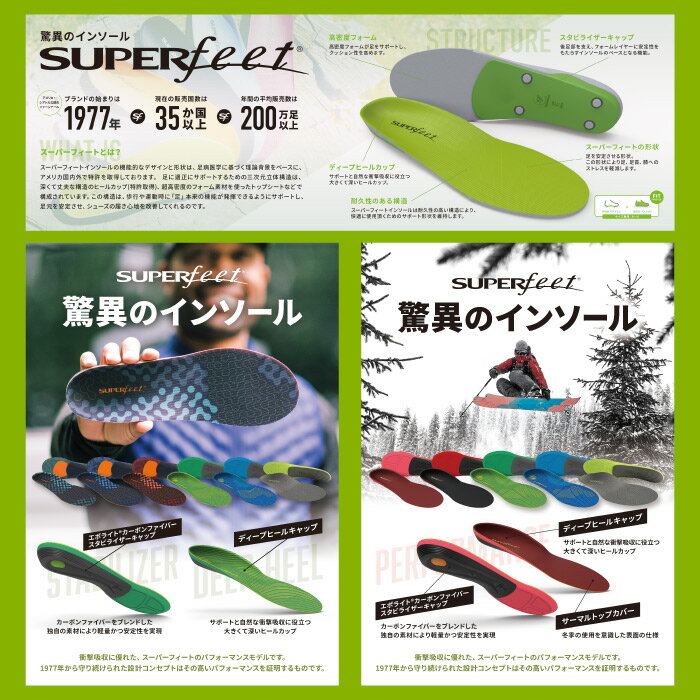 - アイテム詳細 スーパーフィートカーボンは、スタビライザーキャップに炭素繊維(カーボン)配合の硬質超軽量素材を採用し、耐久性と薄さ・軽さを向上させた革新的なハイパフォーマンスモデルです。バイオメカニクスに基づいた設計で開発されたスーパーフィートカーボンは、軽いだけでなく、フィット感を向上させ、スパイクシューズのようなタイトフィットのシューズにも着用が可能です。