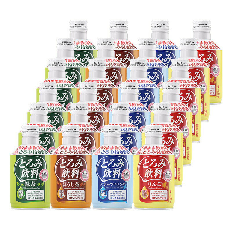 100%国産茶葉で丁寧に仕上げた香り豊かな味わいのとろみ付き緑茶、香ばしいやすらぎの香りを楽しめるとろみ付きほうじ茶、スッキリした味わいのやさしいとろみ付きスポーツドリンク、国産りんご果汁を使用したやさしい甘さのとろみ付きりんごジュースを6本ずつアソートしました。