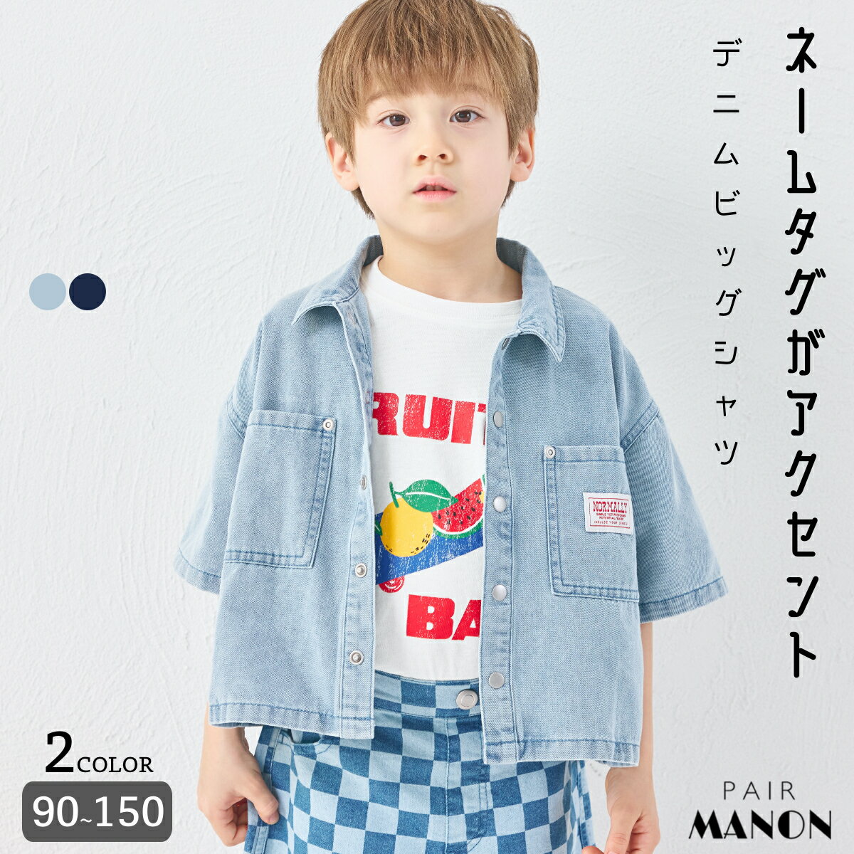 男女通用 带姓名标签 牛仔 短袖宽松衬衫 儿童 女童 男童 男孩 女孩 90cm 100cm 110cm 120cm 130cm 140cm 150cm 春夏 pairmanon 幼儿园 上学 外出 简约 外搭 纯色 时尚 日常 休闲 pairmanon