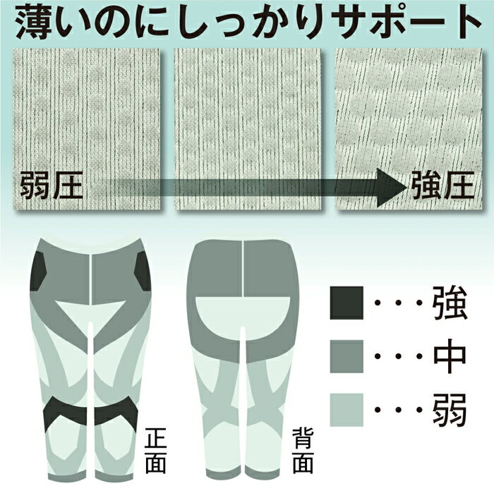 - 日常の歩く・座る動作を快適にしたい。 【薄いのに一枚でしっかりサポート。】 筋力低下により、股関節や膝に負担がかかりやすくなったり、股関節が外施され外側に開きやすくなり、膝や足への負担へとつながります。 従来のテーピングや着圧ではなく、3段階に分けたパワープリントラインで、動作時に負担のかかる部位を段階に応じて調節しながらしっかりサポート。 【軽くて動きにフィット】 旭化成(株)のプレミアムストレッチファイバー「ロイカ」を使用。心地良い伸びと軽さにこだわり抜いた品質高い繊維を使用。体に吸い付くようなフィット感。 伸ばしても、深く曲げても、大きく上げてもぴったりフィットします。 【着脱らくらく】 ぐ〜んと伸びて軽いので、生地をつかんで引っ張り上げる必要なし。