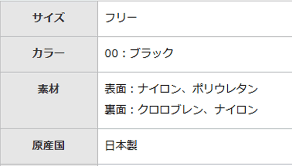 サイズ フリー カラー 00:ブラック 素材 表面:ナイロン、ポリウレタン 裏面:クロロブレン、ナイロン 原産国 日本製。