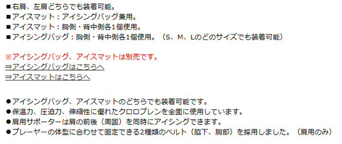 | アイシングバッグ | 胸側・背中側各1個使用。(S、M、Lのどのサイズでも装着可能) ※アイシングバッグ、アイスマットは別売です。 |