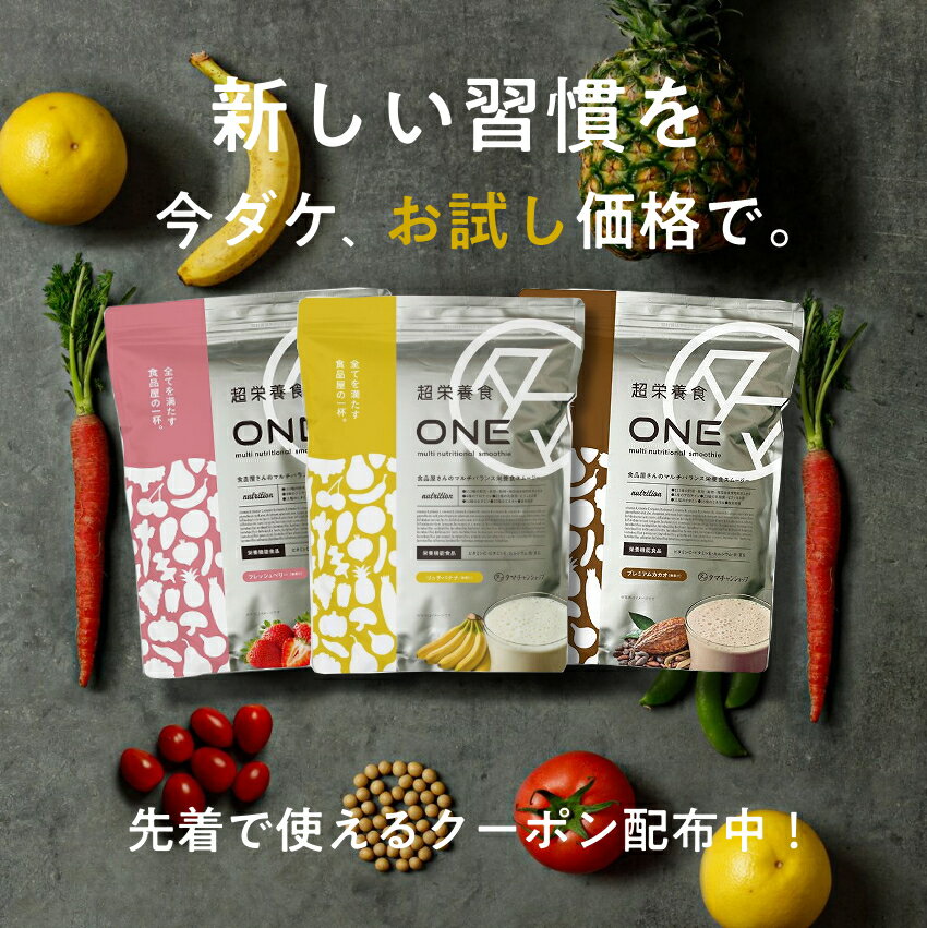 原材料 各種超栄養食ONEの原材料・栄養成分はこちら 配送方法 宅配便で配送 保存方法 高温多湿、直射日光を避け涼しい所に保管してください 可能温度帯 常温 製造国 日本 MADE IN JAPAN 区分 栄養機能食品 栄養成分 1日当たりの摂取目安量(32g)が栄養素等表示基準値(対象年齢18歳以上、基準熱量 2,200kcal)に占める割合:ビタミンC:50~125%、ビタミンE:51~113%、カルシウム:61%、鉄:99%、亜鉛:73% 栄養機能食品 (ビタミンC・ビタミンE・カルシウム・鉄・亜鉛) ※亜鉛は、味覚を正常に保つのに必要な栄養素です。