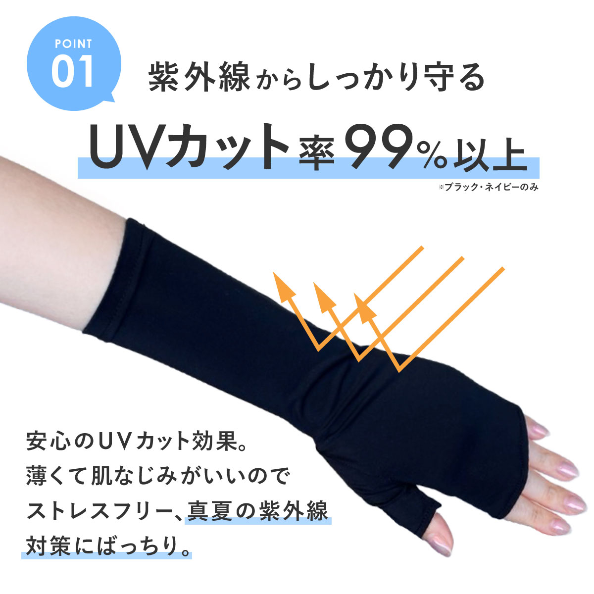 ショート丈ながら、前腕を半分くらい覆う長さがあるので、しっかり日焼け防止してくれるので安心。