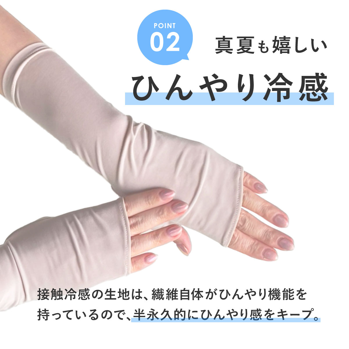 冷感ショートアームカバー 肌から放出される熱気をすばやく逃がす放熱性に優れた生地を使用することで、通気性に優れ、蒸れにくく快適な着け心地を実現。