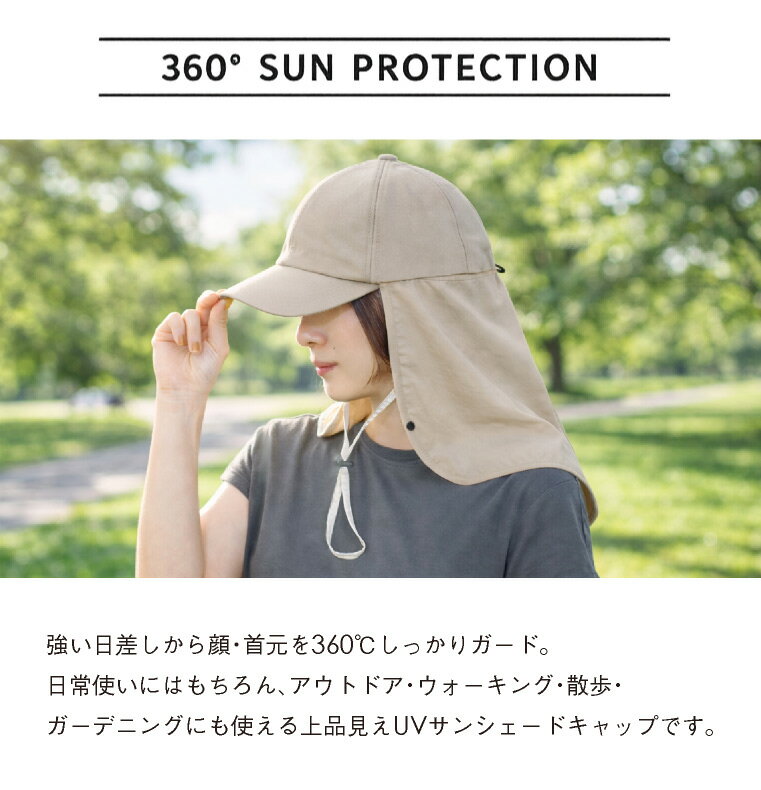 360° SUN PROTECTION 強い日差しから顔・首元を360°しっかりガード。