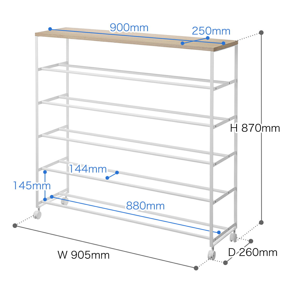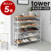 スペック 品名 tower( タワー )天板付きシューズラック 5段 キャスター付 W90 品番 / JAN ホワイト:1465 / 4903208014656 ブラック:1466 / 4903208014663 サイズ 外寸:約 幅 905mm×奥行き 260mm×高さ 870mm( キャスター含む ) [ 内寸 ] 天板:約 幅 900mm×奥行き 250mm 1段あたり:約 幅 880mm×高さ 145mm パイプの間隔:約 144mm 収納可能数 シューズ / ブーツ:20足( 大人用 ) ヒール / サンダル:25足( 大人用 ) ※サイズや形状によって収納数は前後します。