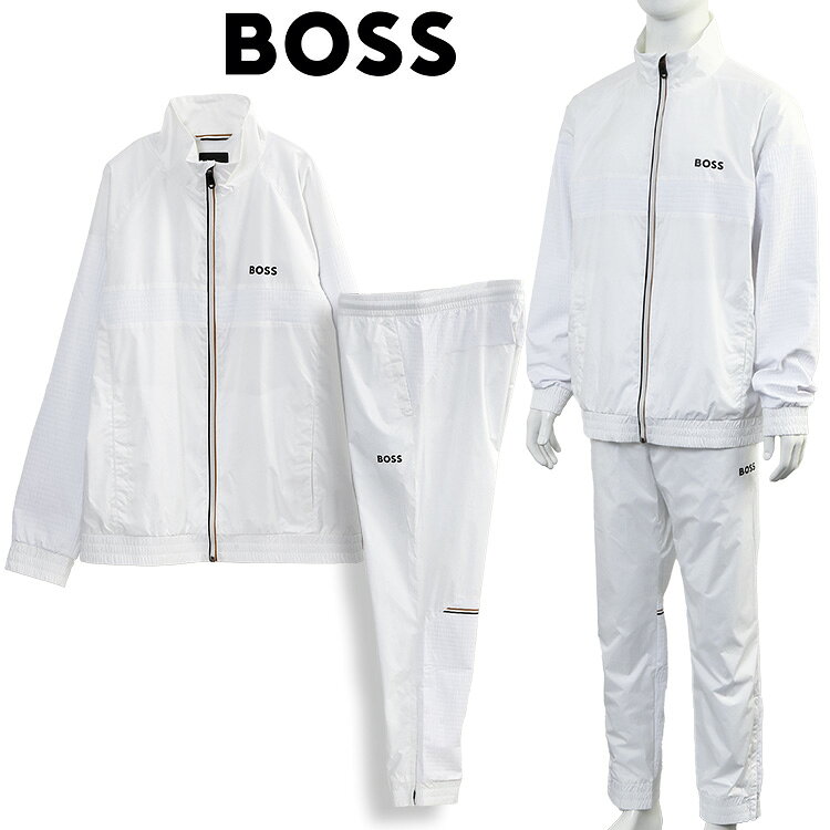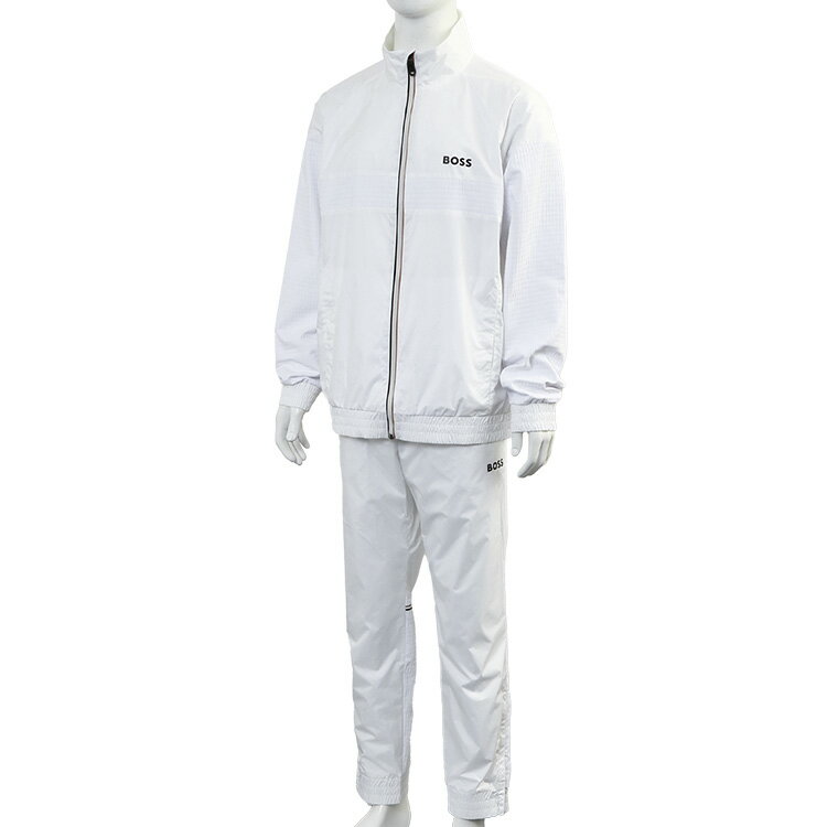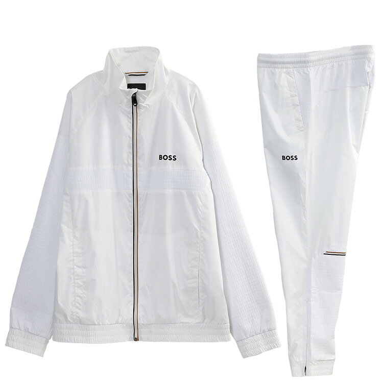 ブランドヒューゴボス HUGO BOSS 商品番号50541286 素材100% ポリエステル、ライニング:100% ポリエステル、袖:79% ポリエステル+21% エラストマルチエステル カラー100_WHITE 仕様トップス:シングルジップ開閉、ポケット×2、ボトムス:ウエストゴム+ドローコード、スナップボタンポケット×2、ジップポケット×1、裾ジップ 生産国VIETNAM 付属品商品タグ。