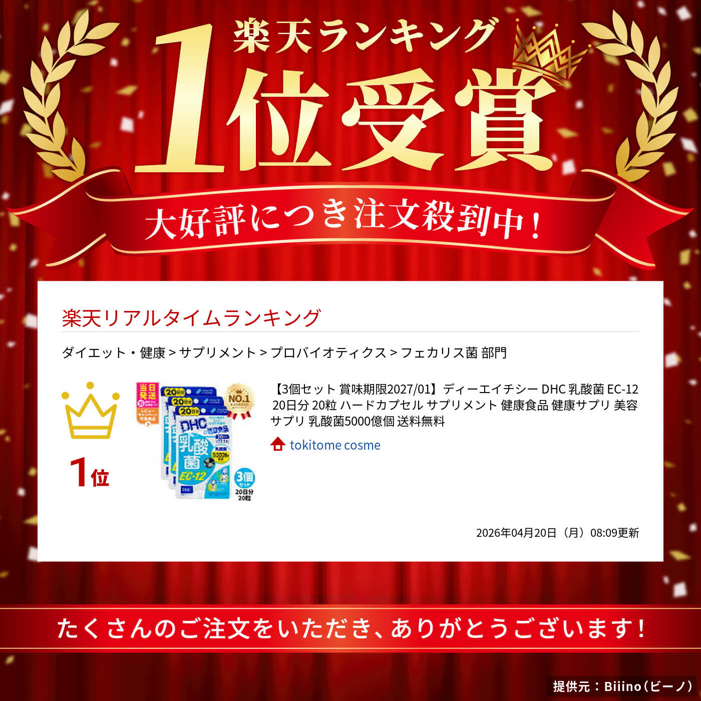 商品説明 商品名 DHC 乳酸菌 EC-12 20日分 20粒 乳酸菌利用食品 内容量 4.5g[1粒重量229mg(1粒内重量180mg)×20粒] 詳細 乳酸菌EC-12は、1日1粒で5,000億個以上の乳酸菌EC-12とラクチュロースを補うことができます。
