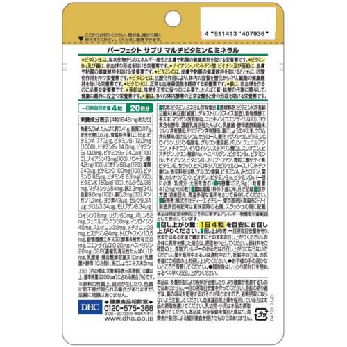 お店TOP>健康食品>ビタミン類>マルチビタミン>マルチビタミン+マルチミネラル>DHC パーフェクトサプリ マルチビタミン&ミネラル 20日分 (80粒×3セット)商品区分:栄養機能食品(栄養成分:ビタミンB1、ビタミンB12、ナイアシン、パントテン酸、ビオチン、ビタミンC、ビタミンE、ビタミンK、鉄、亜鉛、銅)【DHC パーフェクトサプリ マルチビタミン&ミネラル 20日分の商品詳細】●ビタミンとミネラルをはじめとした健康の基本を支える多彩な栄養素と健康な毎日を応援するサポート成分を、40種