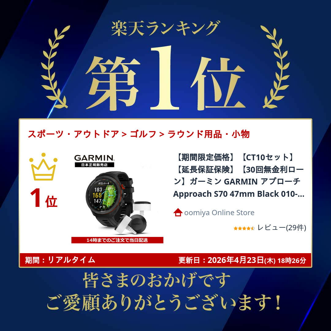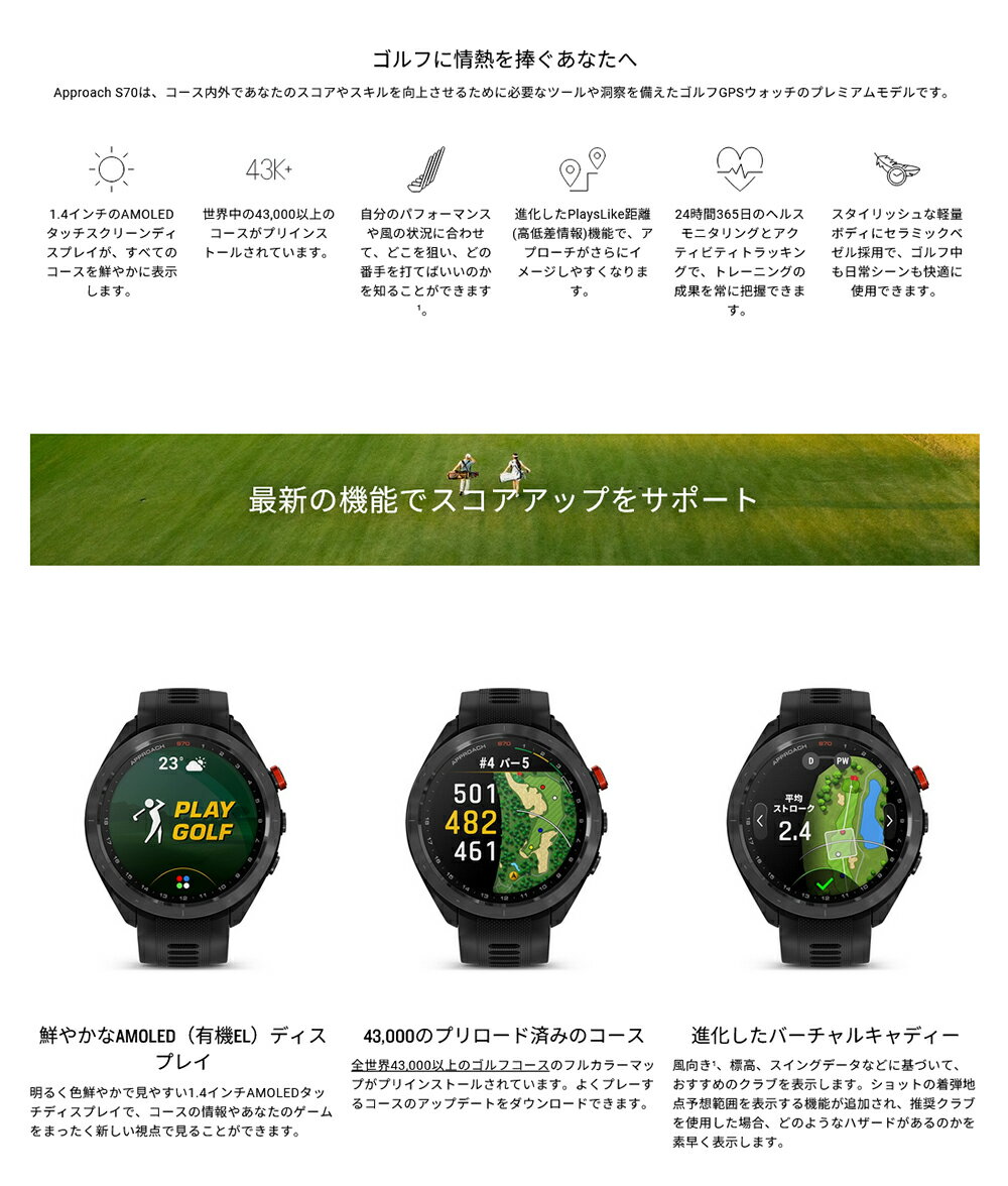 Spec ブランド名 GARMIN ガーミン 商品名 Approach S70 47mm アプローチ メーカー型番 010-02746-22 ブラック010-02746-71 ブラック/Copper 仕様 稼働時間ゴルフモード:最大20時間 / スマートウォッチモード:最大14日間収録コース全世界約43,000以上のゴルフコースを収録 高感度GPS GPS / みちびき(補完信号) / GLONASS GPS+GLONASS+GNSSマルチバンド コースレイアウトマップ Ver.2 バーチャルキャディ ver.2 ハザードビュー Ver.2 高低差情報 風速/風向き表示 ver.2 光学式心拍計 GARMIN PAY ミュージックプレーヤー ワイヤレス コースアップデート 本体性能 ディスプレイタイプ AMOLED QUICKFITウォッチバンド互換性ストラップ素材シリコン 本体サイズ47 x 47 x 13 mm 重量 56 g防水等級5 ATMタッチスクリーン ディスプレイサイズ直径1.4インチ 解像度454 x 454 ピクセルカラー表示 内蔵メモリ/履歴1 GB 充電ケーブル TYPE-C付属 詳細 Approach S70 Series。