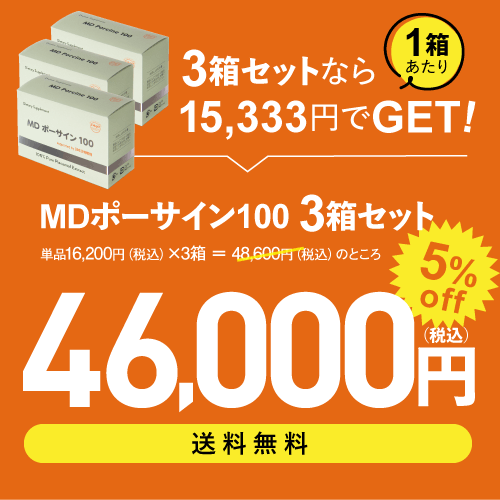 - 配合成分につきましては、上記の商品名をクリックしてご確認ください。 内容量 100粒(約1ヶ月分)×3 特徴 高純度(*1)のJBPプラセンタエキス末「豚プラセンタエキス純末200mg(*2)」「馬プラセンタエキス純末150mg(*2)」を配合。 プラセンタの大手メーカー、株式会社日本生物製剤の技術協力のもと、“ラエンネック製法”の抽出技術を、国産プラセンタ(豚・馬)に応用。 純粋(*1)で質の高い(*3)プラセンタエキス末(豚・馬)のみがギュッと閉じ込められています。 「MDポーサイン100」は、日本国内で厳重に健康管理されてきた“豚と馬のプラセンタ”を採用しました。 医師監修のもと、研究を重ね独自のバランスで配合されています。 日本生物製剤製のJBPプラセンタエキスを基準以上含有し、厳しい品質基準に適合した製品のみに表示が許諾されている「JBPマーク」が付いた信頼のサプリメントです。 【 プラセンタとは 】 プラセンタは、胎児の発育に必要不可欠な組織「胎盤」のことです。 プラセンタには、たんぱく質・ビタミン・脂質・糖質・ミネラル・アミノ酸・酵素などの栄養素と各種成分が豊富に含まれており、美容と健康をサポートする力があります。 豚プラセンタの特徴 … ヒト由来のものと構造が似ているとされています。 馬プラセンタの特徴 … 栄養価が高く、豊富な栄養成分の中でもアミノ酸が非常に多く含まれていると言われています。 (*1)メーカー商品において (*2)1粒あたり (*3)日本生物製剤の品質基準において お召し上がり方 食品として1日3〜6粒を目安に水または、お湯で召し上がり下さい。 ※小児・妊婦又は妊娠の可能性がある方・病気療養中の方・薬剤を摂取されている方は、医師にご相談のうえご使用ください。 使用上のご注意 〇原材料名(ここをクリックし)をご確認のうえ、食物アレルギーのある方はお召し上がりにならないでください。 〇開封後は冷暗所で保存し、賞味期限に関わらずお早めにお召し上がりください。 〇体質や体調により、まれにお体に合わない場合があります。その場合はお召し上がり量を減らすか、使用を中止してください。 〇小さなお子様の手の届かないところに保管してください。 〇本品は多量摂取により疾病が治癒したり、より健康が増進するものではありません。1日の摂取目安量を守ってください。 〇食生活は、主食、主菜、副菜を基本に、食事にバランスを。 ○JBPポーサイン100はインターネット販売禁止商材です。類似品にご注意ください。 原材料名 豚プラセンタエキス末、馬プラセンタエキス末/HPMC、着色料(酸化チタン、赤色102号、青色1号) 栄養成分表示 6粒(2.58g)当たり エネルギー9.9kcal、たんぱく質1.7g、脂質0.1g、炭水化物0.5g、食塩相当量0.081g、プラセンタエキス末2100mg 賞味期限 パッケージに記載 保存方法 直射日光及び高温多湿を避けて、できるだけ涼しいところに保存してください。 商品リーフレットについて 環境に配慮した商品づくりへの取り組みの一つとして、商品リーフレットのペーパーレス化に取り組んでおります。使用方法等の商品詳細情報は、本体ラベル又は化粧箱に掲載の「2次元バーコード」を読み込み、ご確認いただけますと幸いです。お手数をおかけしますが、ご理解賜りますようお願い申し上げます