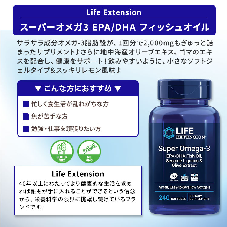 - 毎日健康に過ごしたい方、数値が気になる方へ ※グルテンフリー (小麦フリー) 、Non-GMO (非遺伝子組み換え)【LIFE EXTENSIONのこだわり】 GMP (適正製造基準) 認証 消費期限・使用期限の確認はこちら ご留意事項