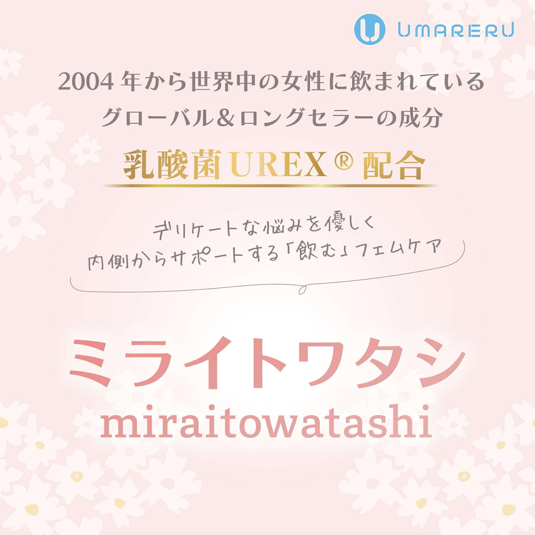 賞味期限枠外下部に年月で記載商品区分健康食品2袋ミライトワタシ 乳酸菌 UREX ユーレックス 生菌96億個(製造時) デリケートケア デリケートゾーン 女性の悩み 臭い フェムケア 膣内フローラ 30代 40代 50代 サプリ 閉経 妊活 更年期 ミライトワタシへ!エビデンスしっかり 乳酸菌ユーレックスは世界30か国の女性に愛用されています リピート率店内1位 プロバイオティクスのリーディングサプライヤーである、クリスチャン・ハンセン社とタッグを組み開発!安心してお飲みいただけます。