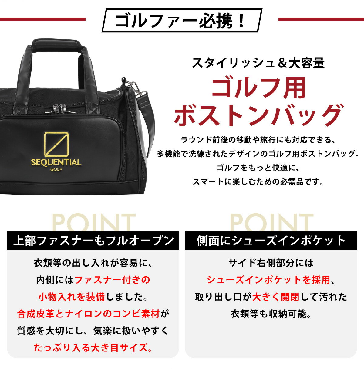 機能性とデザイン性を兼ね備えたこのゴルフ用ボストンバッグは、ゴルフの行き帰りや週末の遠征にぴったりのアイテムです。