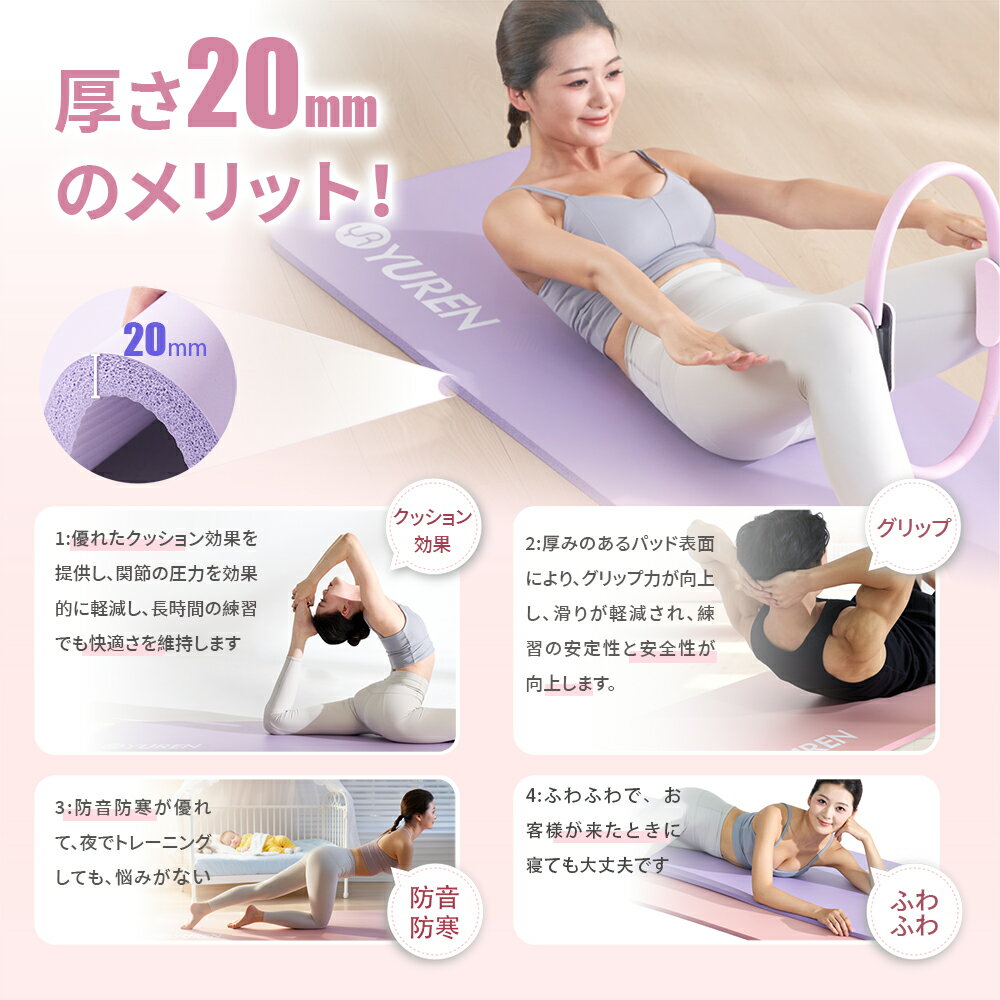 メーカー希望小売価格はメーカーサイトに基づいて掲載しています 商品詳細 商品名 YUREN ヨガマット 素材 NBR サイズ 長さ:195CM 広さ:61CM 厚さ:20MM 重量 950g 特徴 ❤20mmヨガマット:同じ大きさの10mmマットと比べると、クッション性はもっと優れています。筋トレ中に肘、膝と腰への負担を軽減し、腰や背中と地面を接触する時に痛みを解消できるだけでなく、効果的に音を防ぐこともできます。